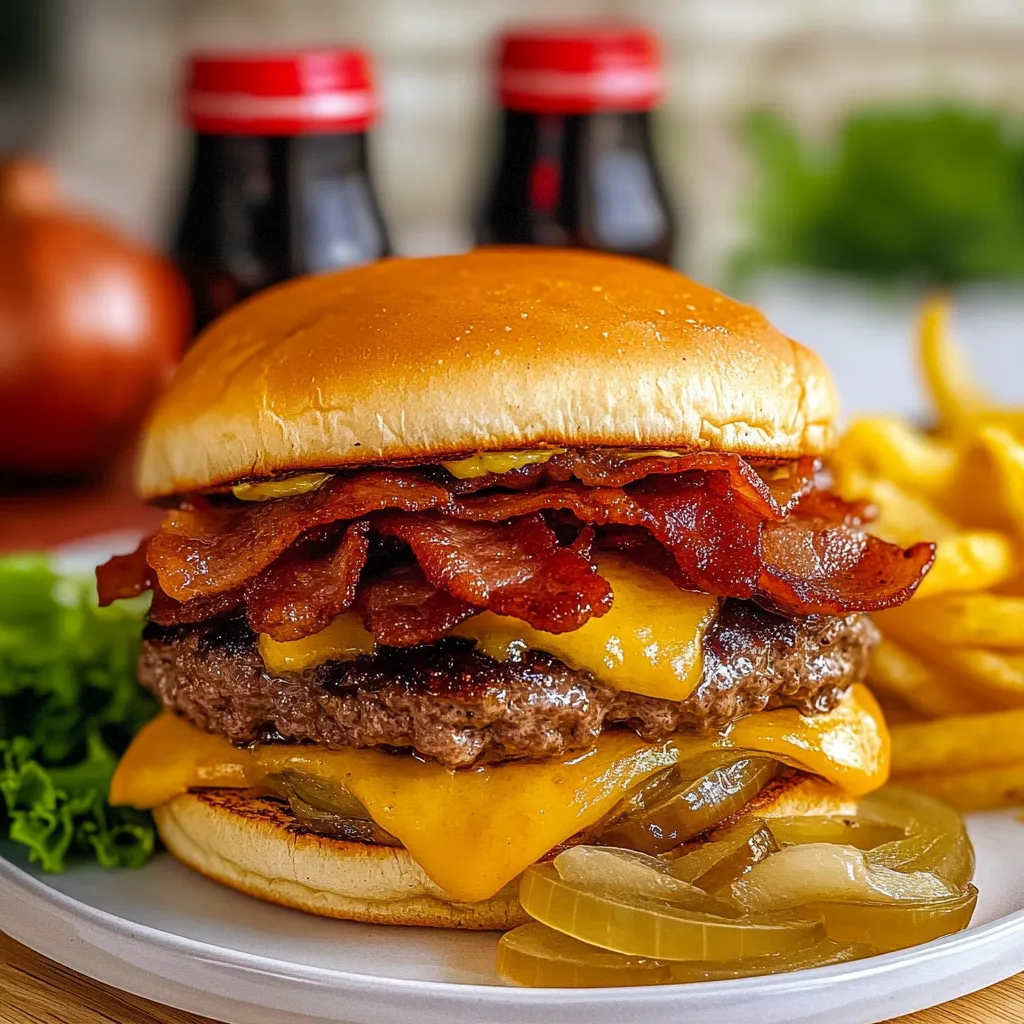 Delicious Bacon Cheeseburgers topped with sweet, caramelized Coca-Cola onions, perfect for summer barbecues or any casual gathering.