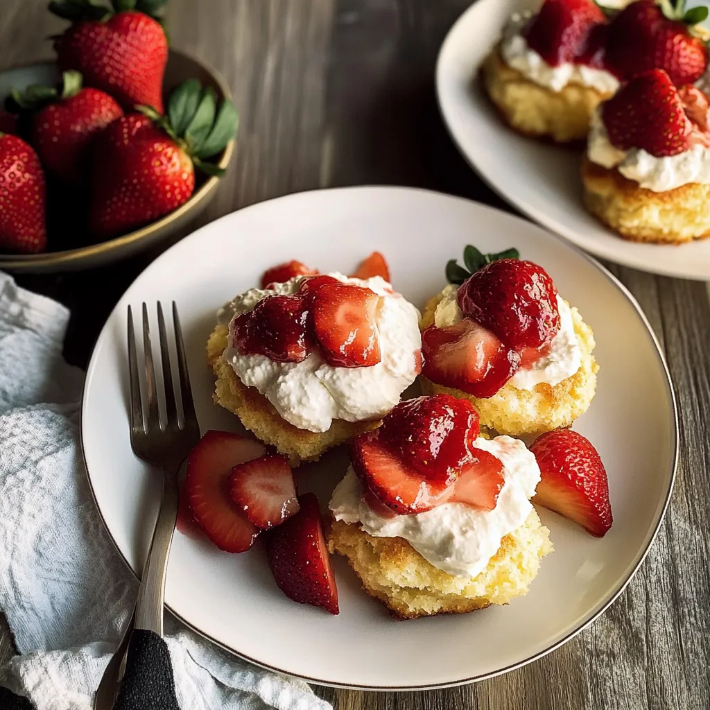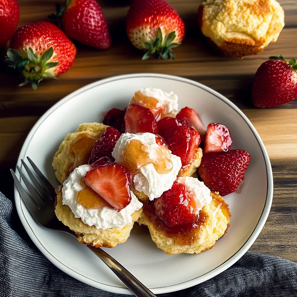 A delightful dessert that combines buttery, flaky biscuits sweetened with brown sugar, topped with fresh strawberries and whipped cream.