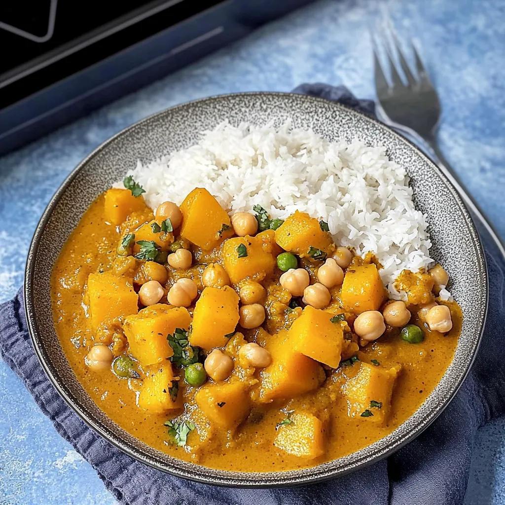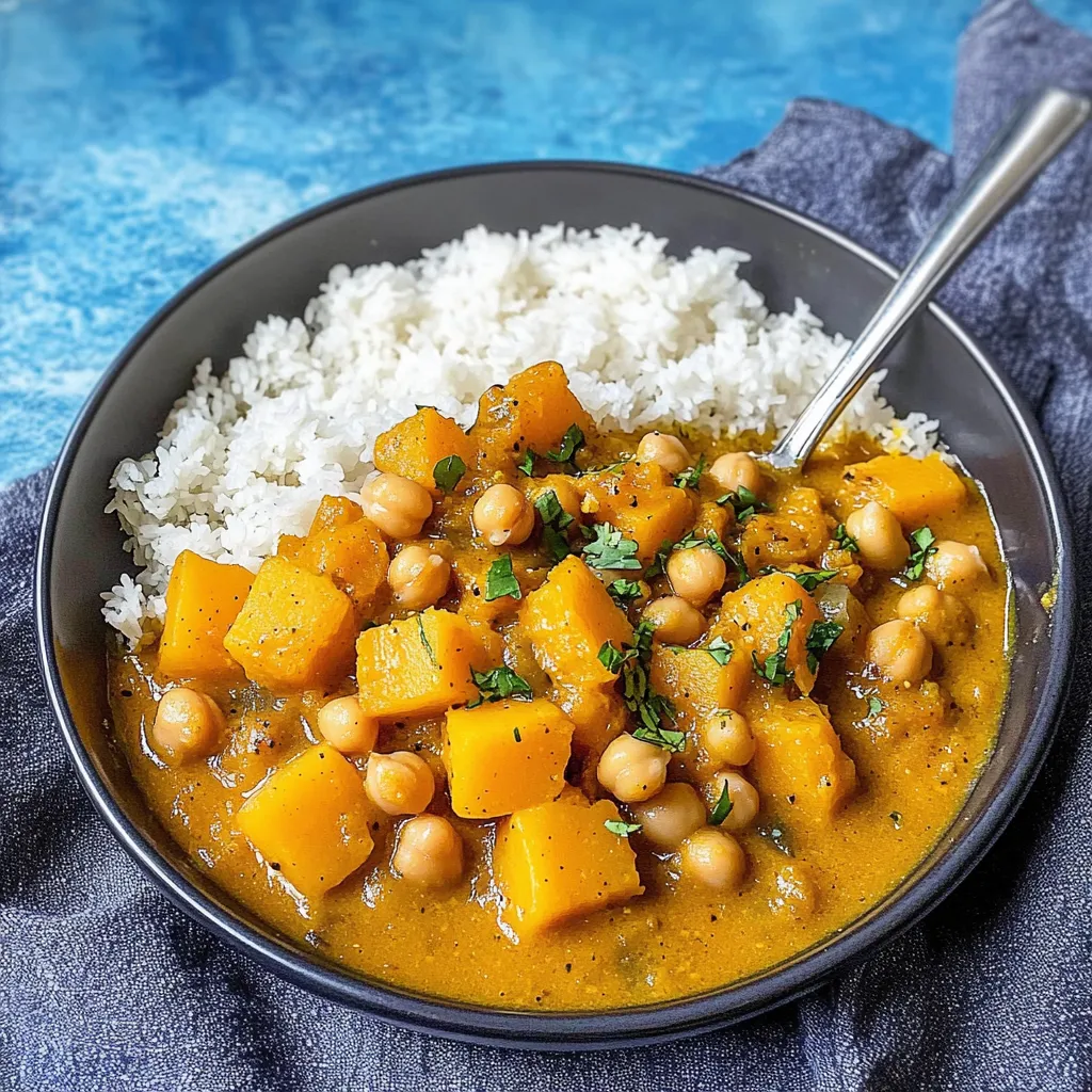 A warm and inviting Butternut Squash Curry with Chickpeas; a comforting vegan dish rich in flavor and perfect for cozy dinners or entertaining.