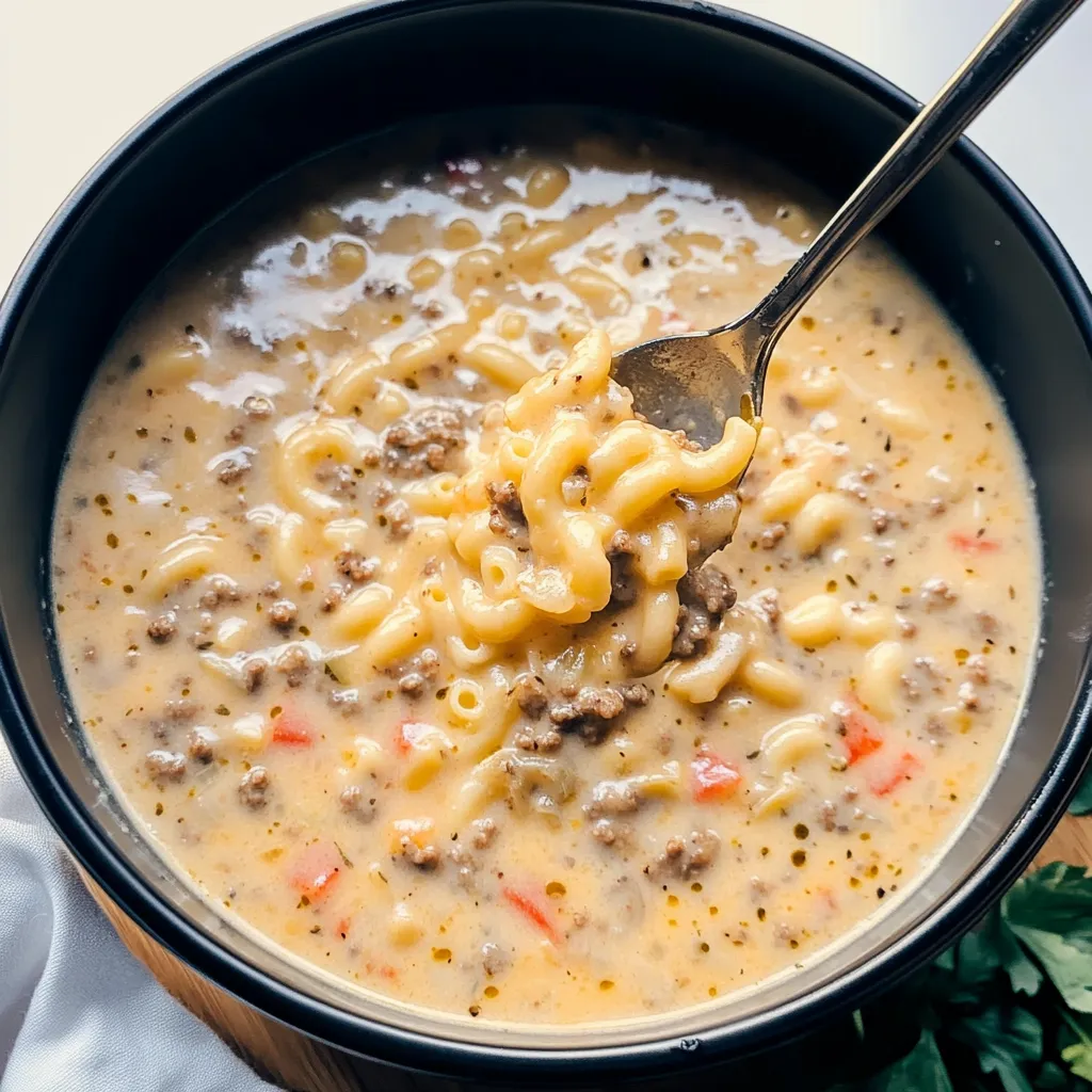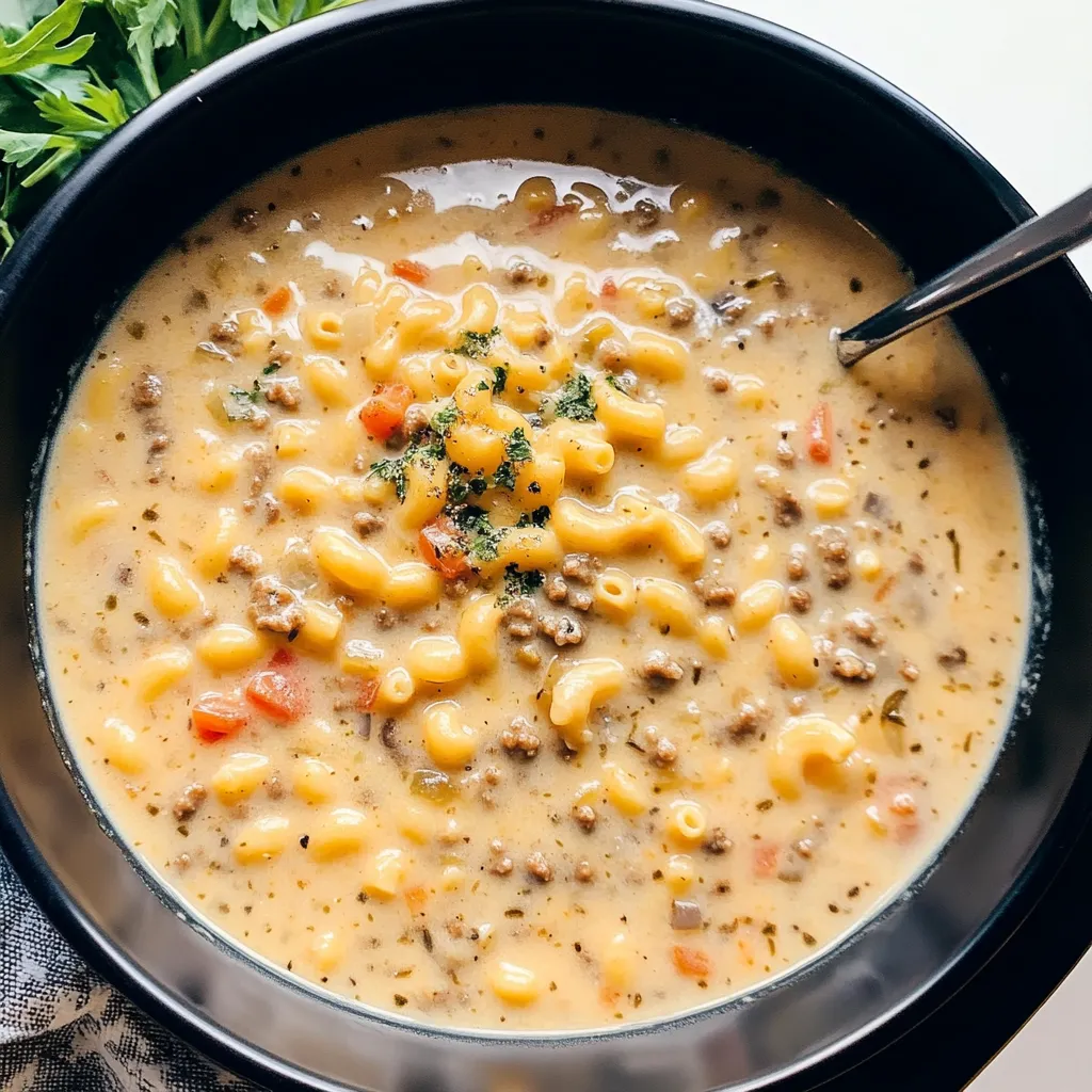 Savor the comforting flavors of cheeseburger macaroni soup Easy recipe for a hearty meal that warms your soul in every spoonful