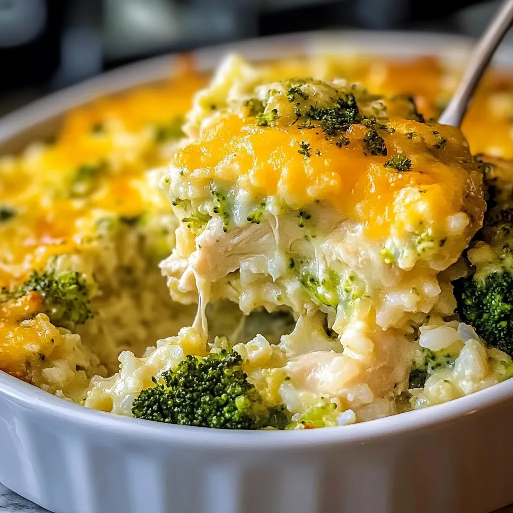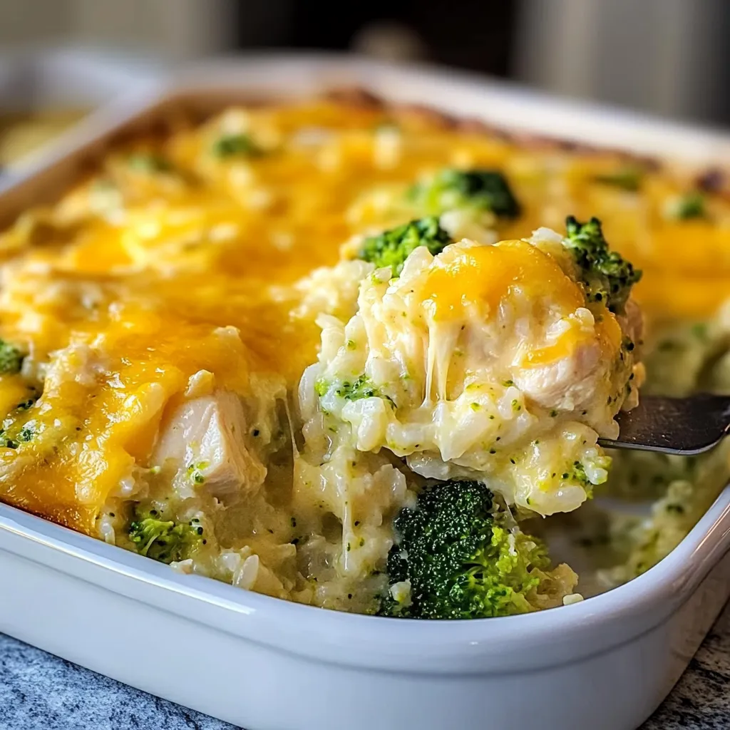 A comforting and cheesy casserole filled with tender chicken, vibrant broccoli, and creamy goodness, all wrapped in fluffy rice.
