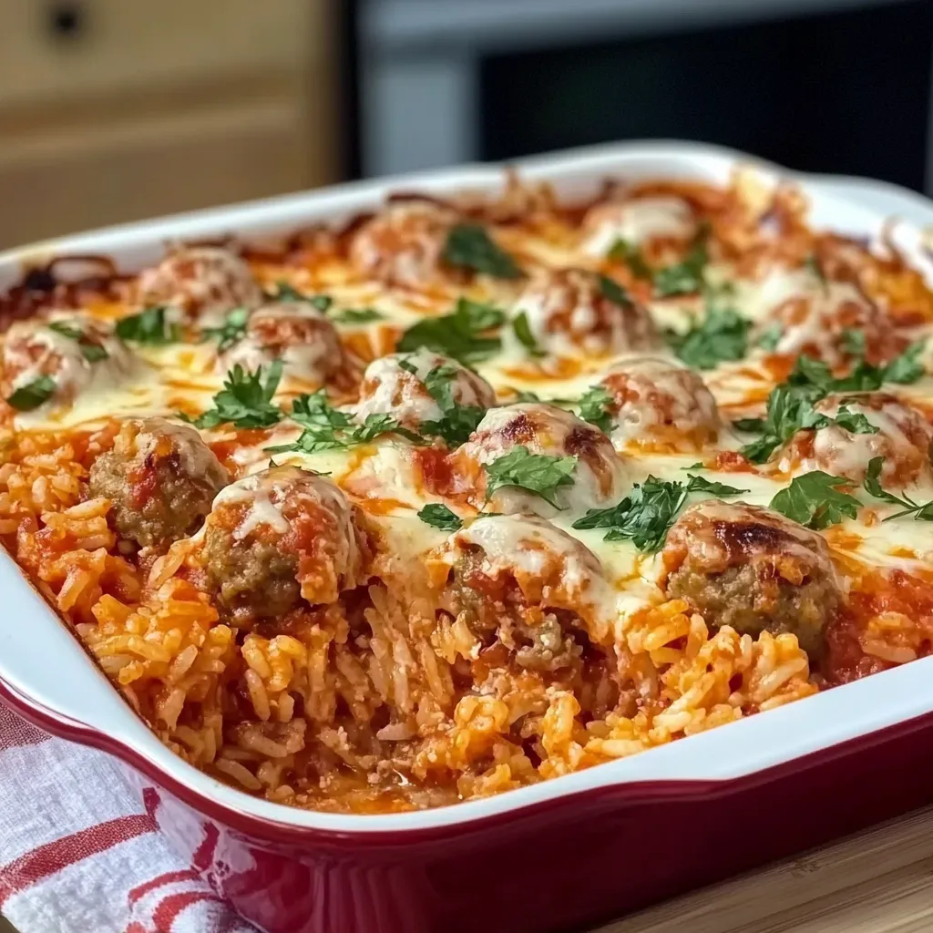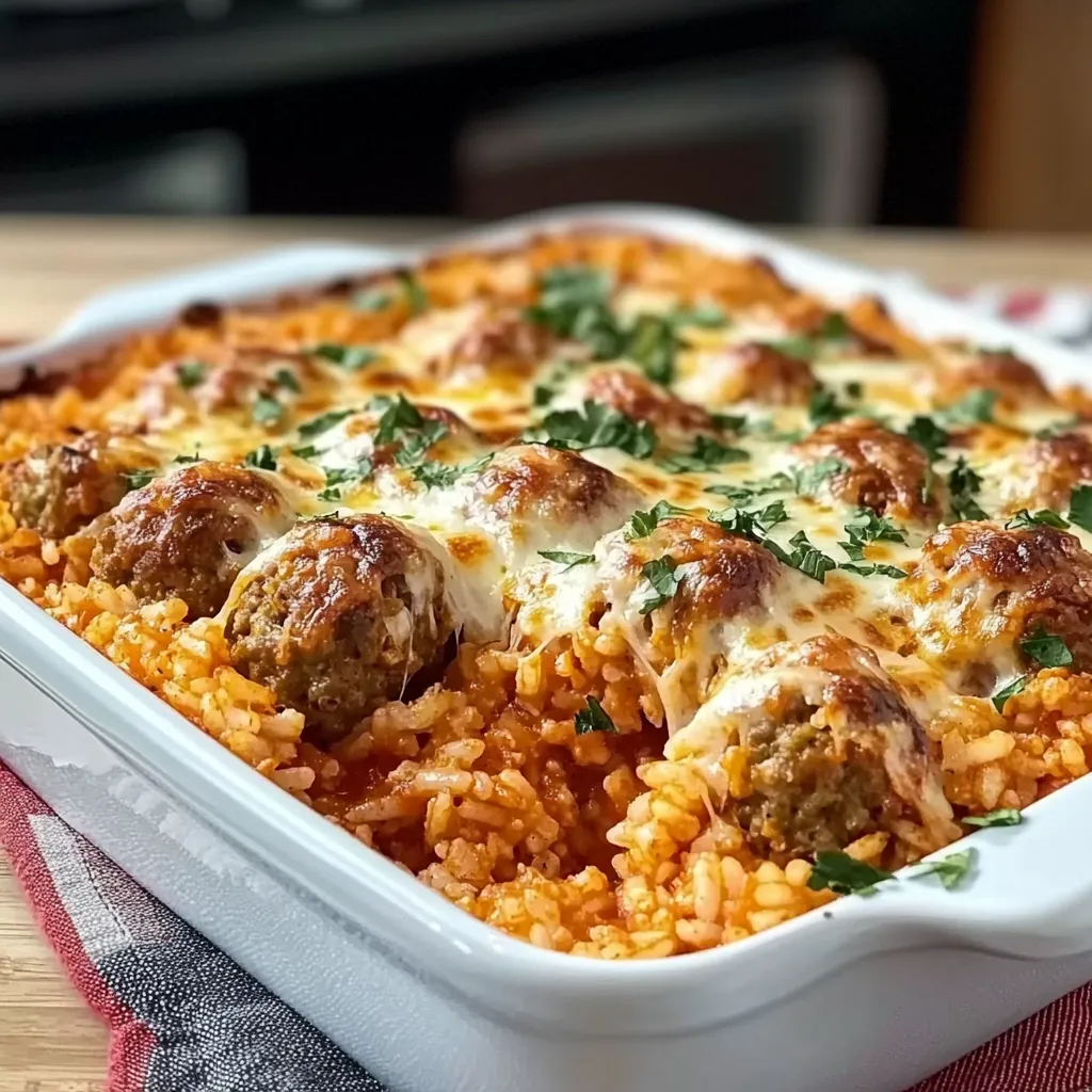 Delight in this cheesy meatball rice casserole a quick and tasty dish perfect for family dinners Easy to prepare full of flavor