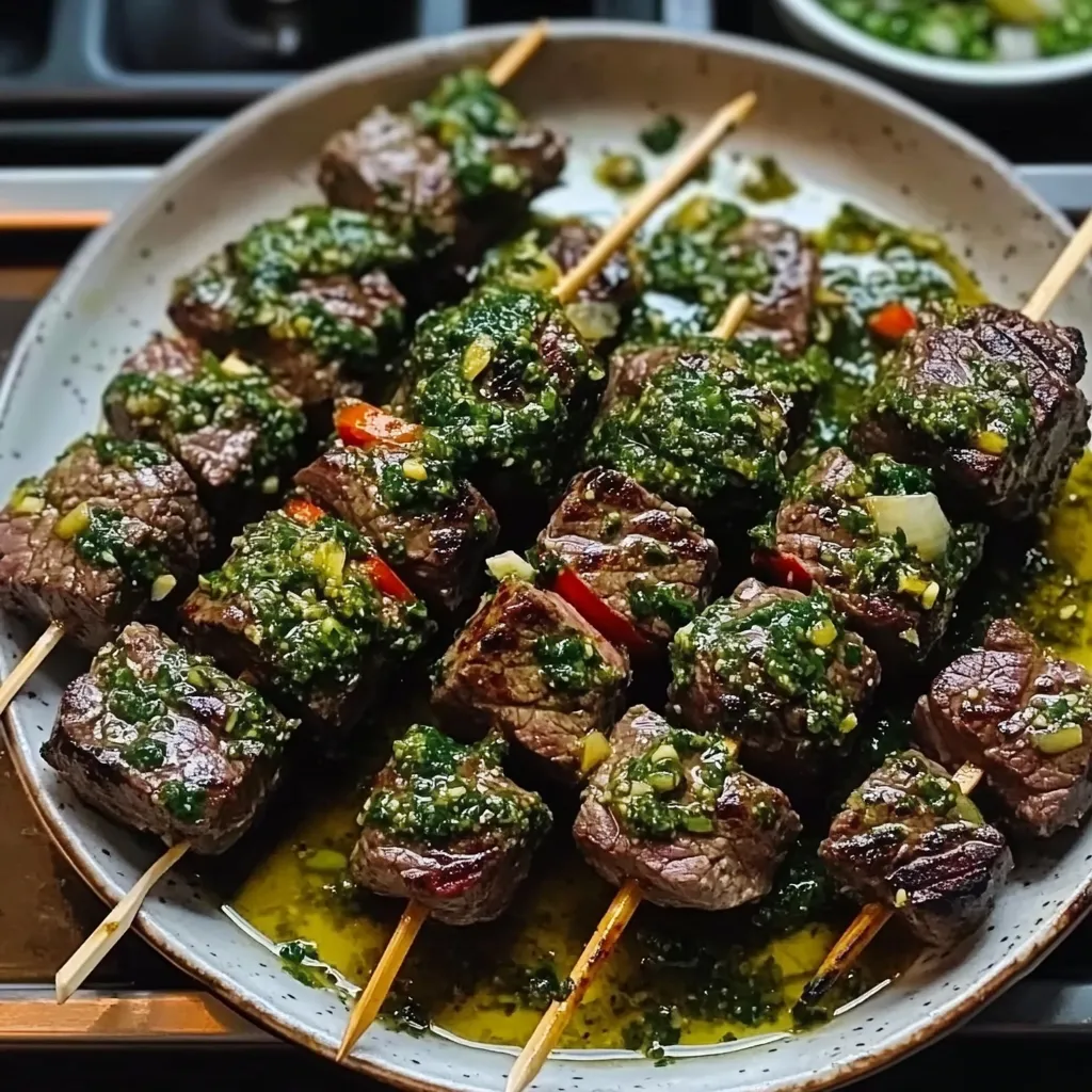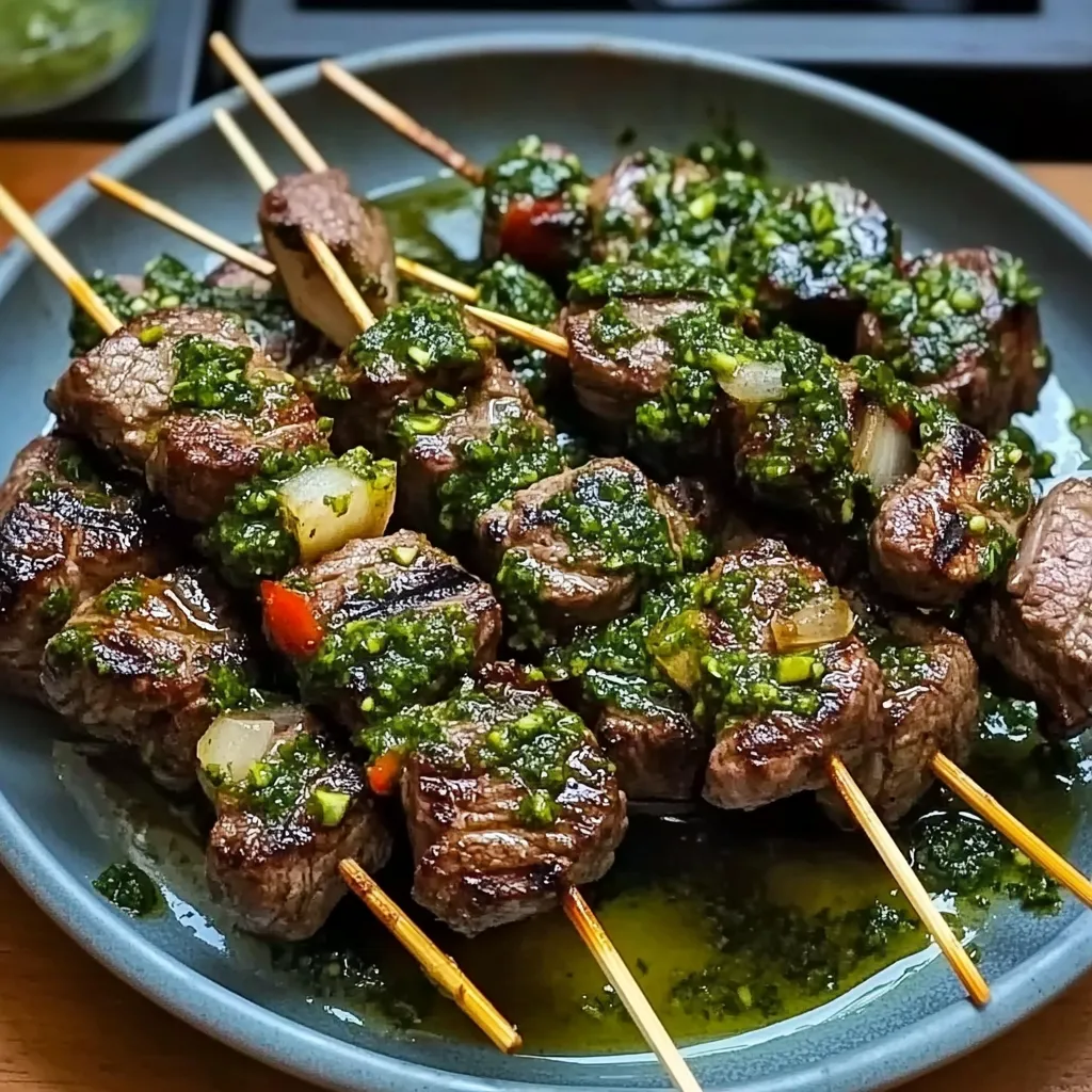 Delightful Chimichurri Steak Skewers combining marinated beef with vibrant chimichurri sauce, perfect for summer evenings.