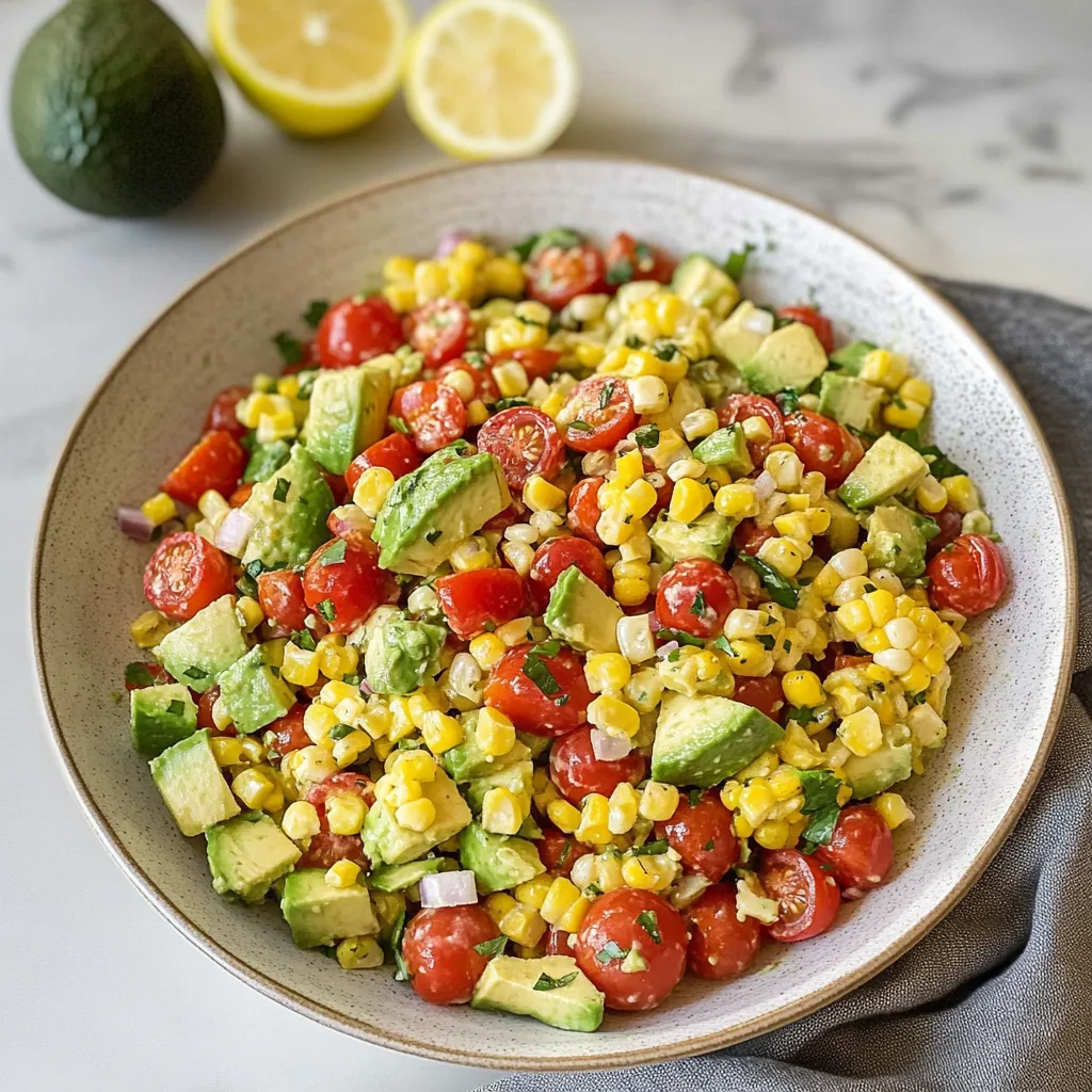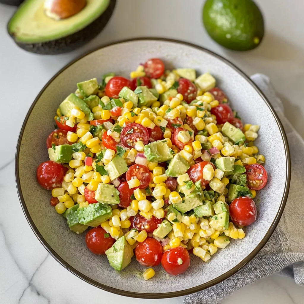 A bright and colorful salad that captures the essence of summer with sweet corn, juicy tomatoes, and creamy avocado, perfect for any occasion.