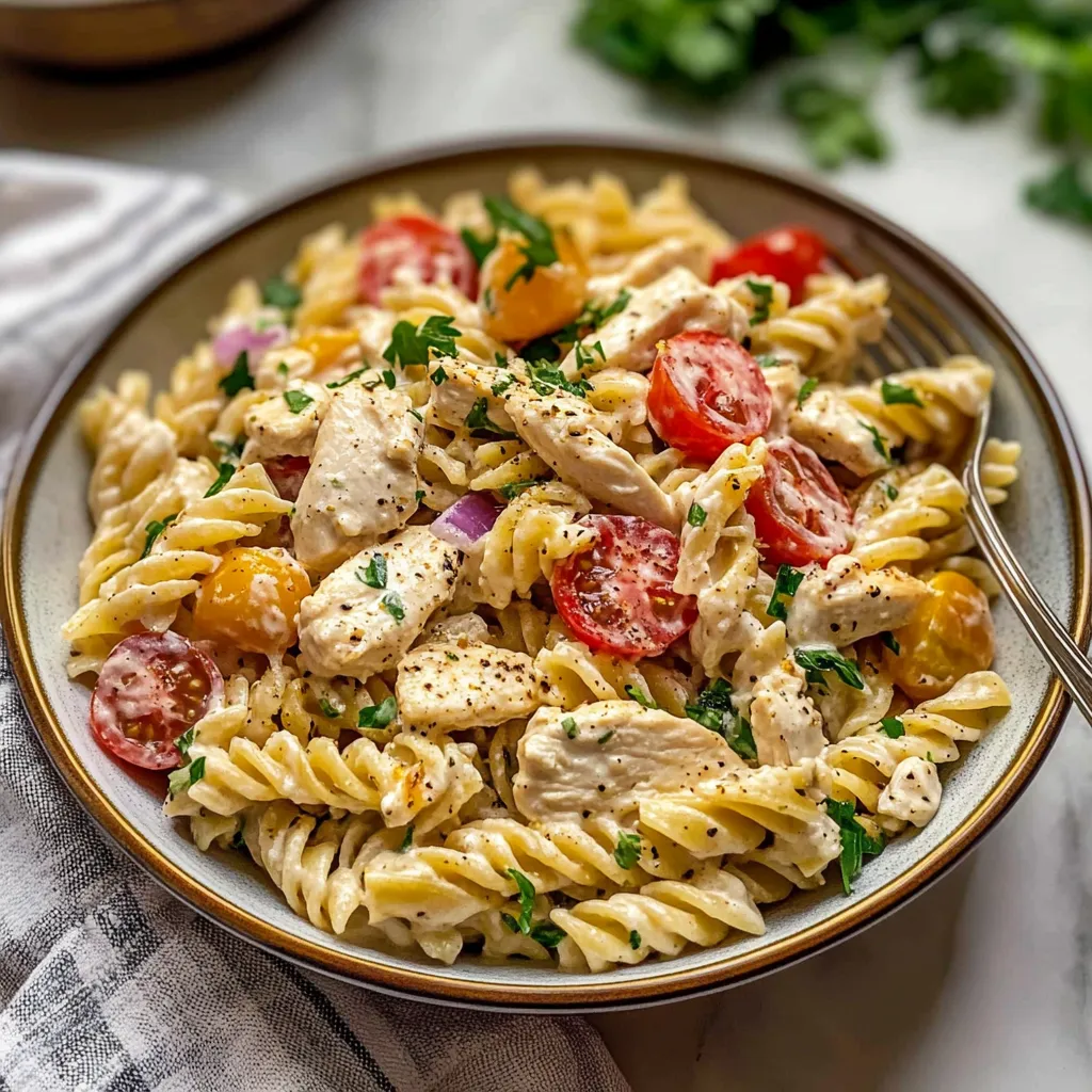 - Combine: Into the dressing, add in the cooled pasta, shredded chicken, chopped vegetables, and herbs (if using). Gently fold everything together, making sure that the creamy dressing envelops every morsel.