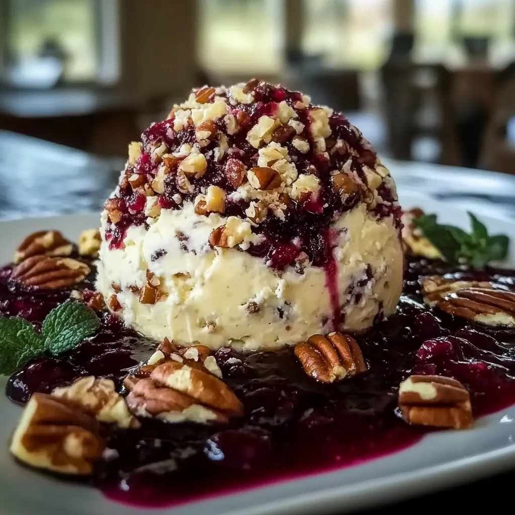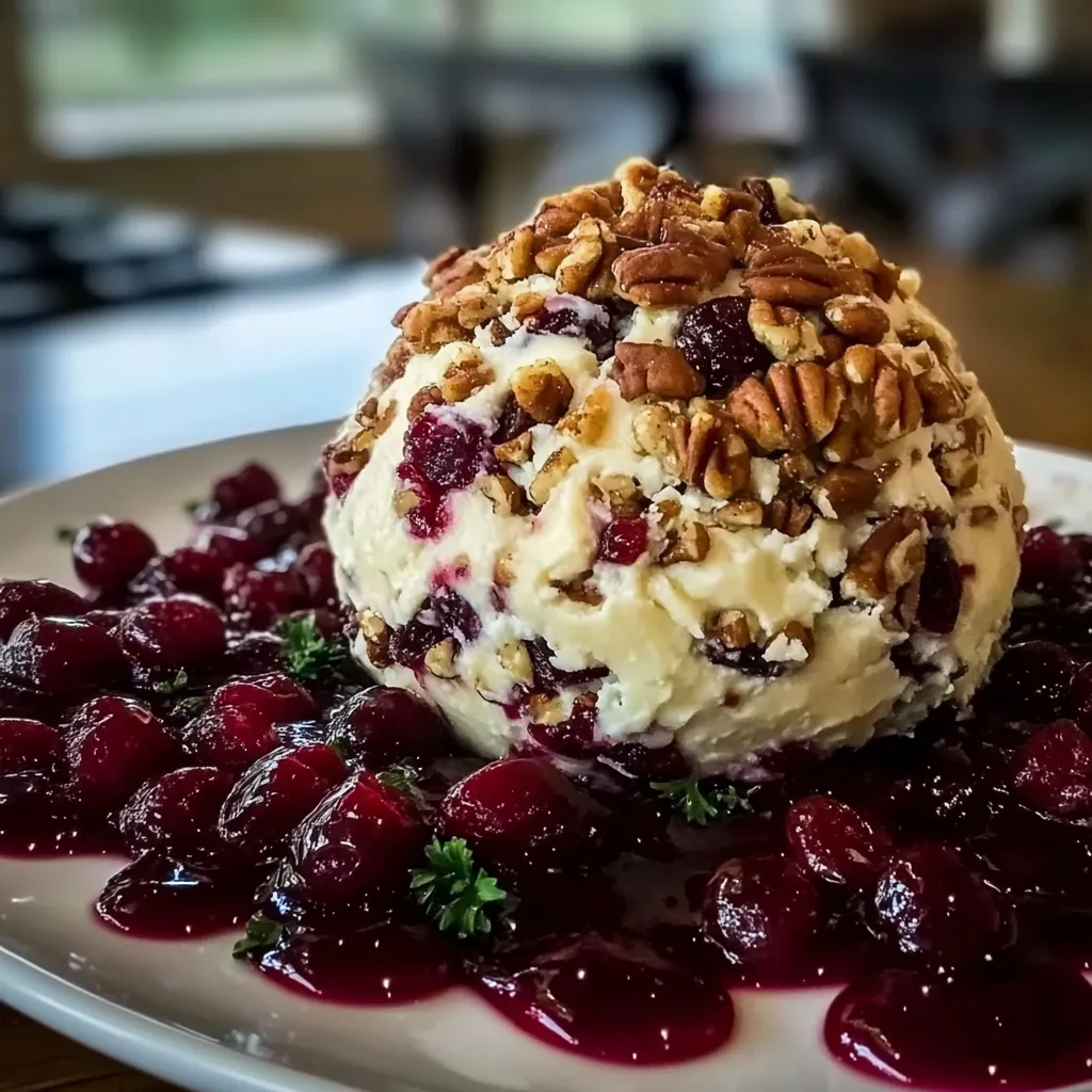 A delightful blend of rich cream cheese, tart cranberries, and crunchy pecans rolled into a dippable cheese ball, perfect for holiday gatherings.