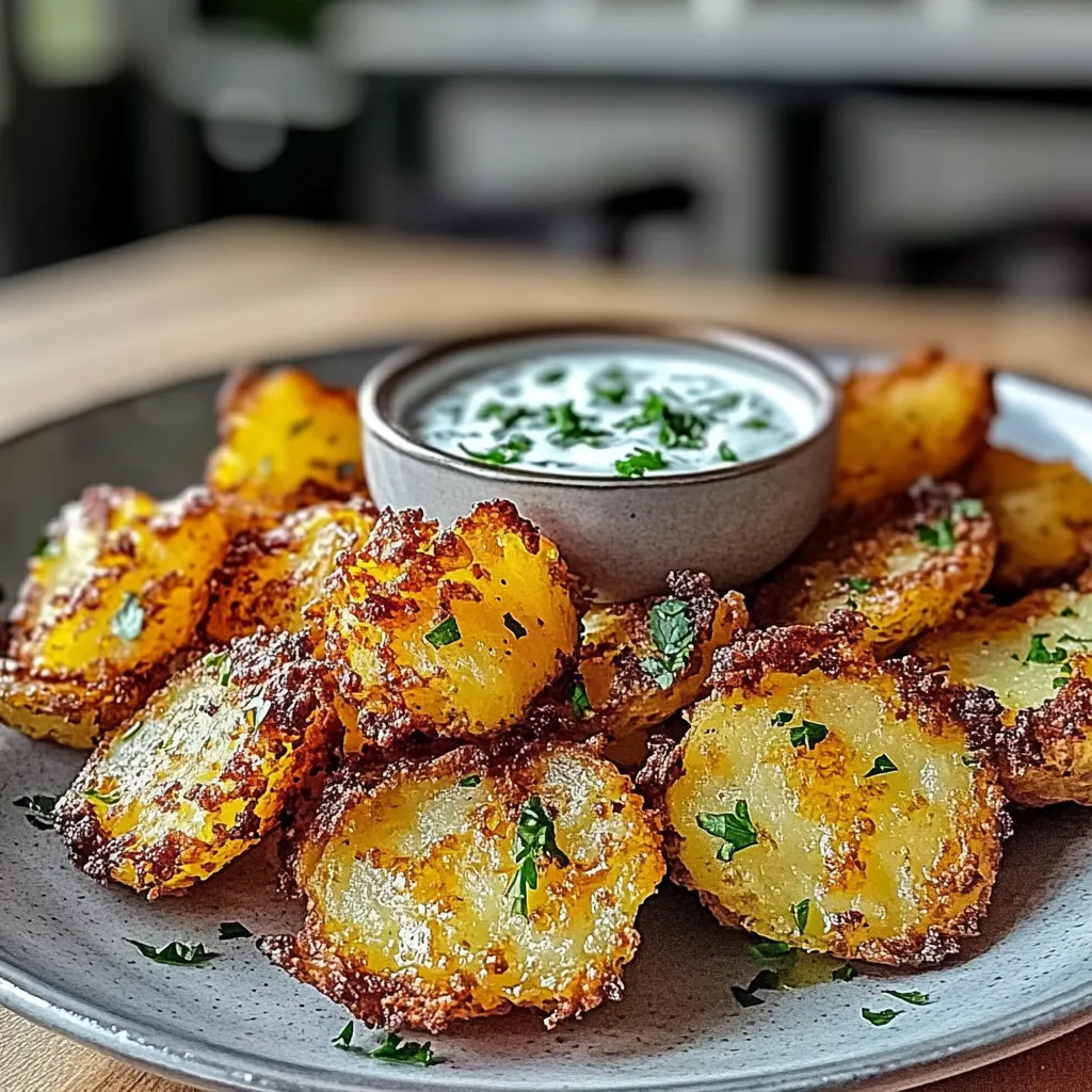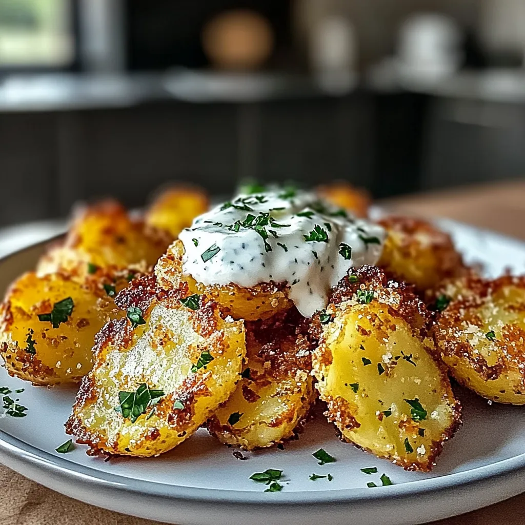 Indulge in Crispy Smashed Potatoes paired with a tangy Yogurt Dip Perfect for parties or a tasty snack Discover this delicious recipe now