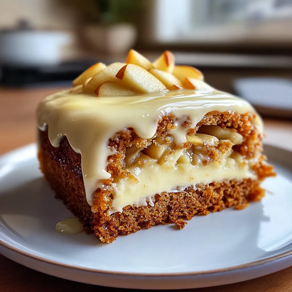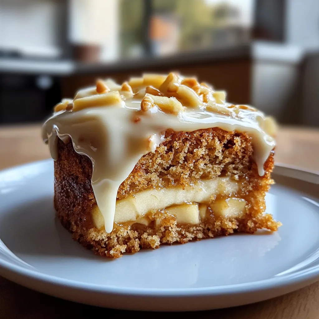 A moist and flavorful apple cake topped with creamy frosting, perfect for fall gatherings and cozy afternoons.