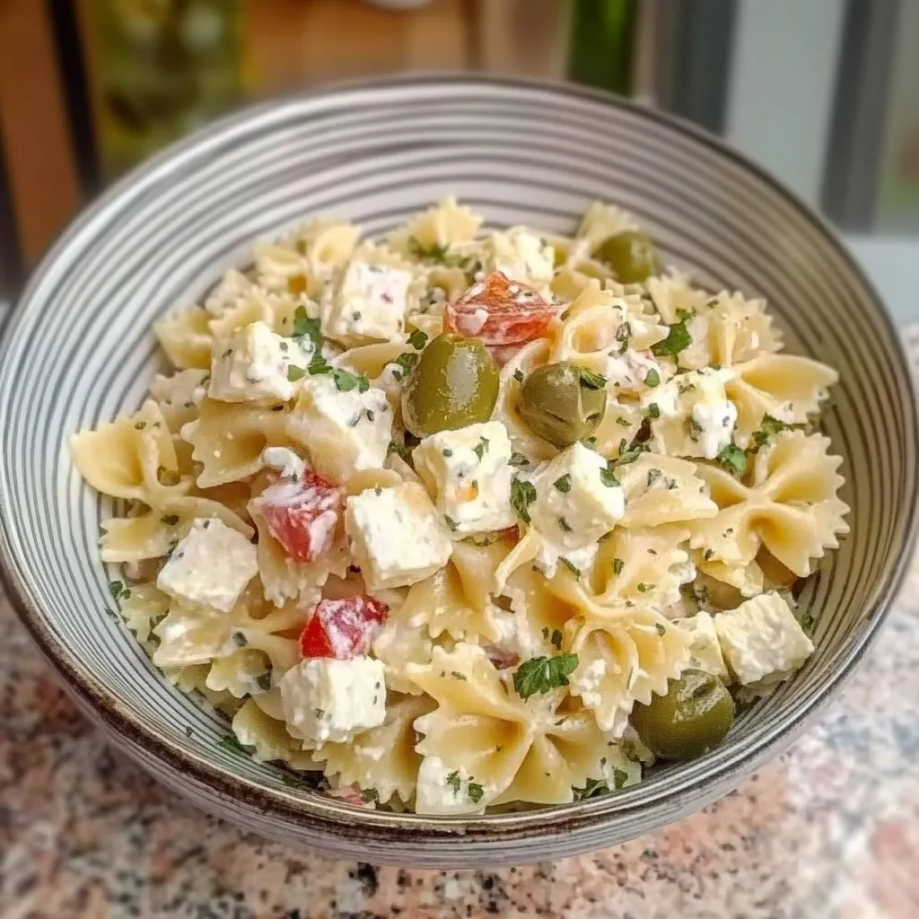 A delightful pasta salad inspired by the classic dirty martini, featuring briny olives, a hint of vermouth, and fresh herbs. Perfect for summer picnics and BBQs!