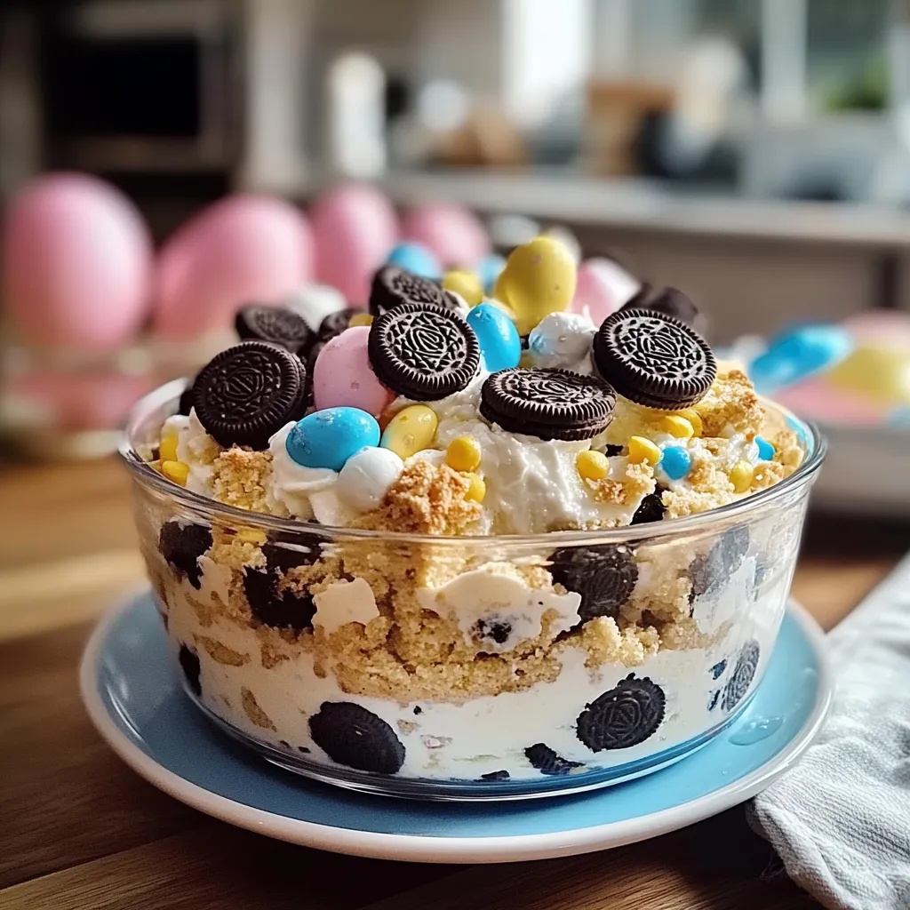 A delightful Easter dessert that combines layers of creamy filling with a crunchy Oreo crust, perfect for family gatherings.