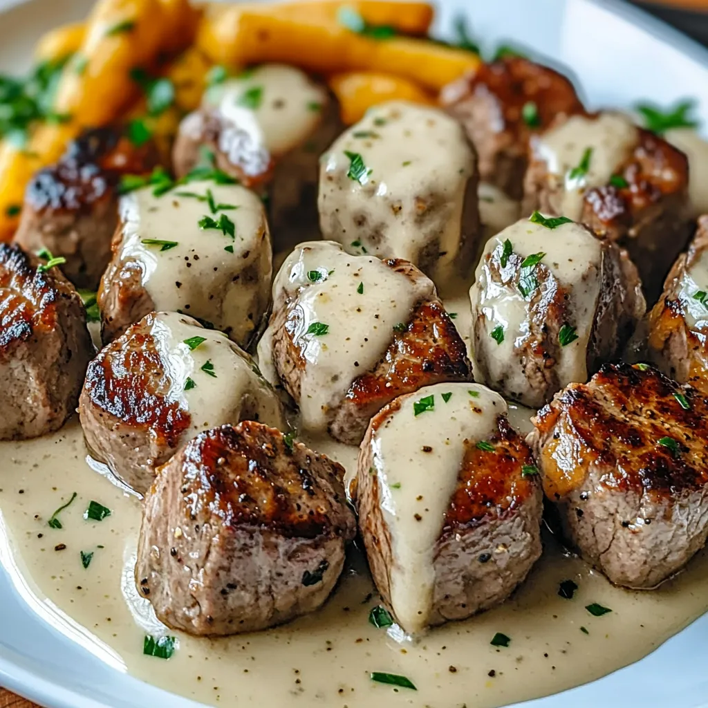 Savor Easy Garlic Butter Steak Bites drizzled in a rich Parm cream sauce Perfect for quick weeknight meals or indulgent gatherings Enjoy gourmet at home