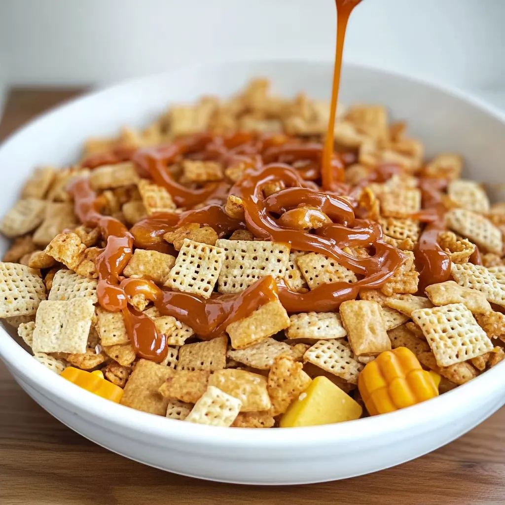 - Mix the dry ingredients: In a large mixing bowl, combine the Chex cereal, pretzel sticks, candy corn, popcorn, and mixed nuts. Toss them gently so everything is evenly distributed—think of playful autumn leaves dancing together!