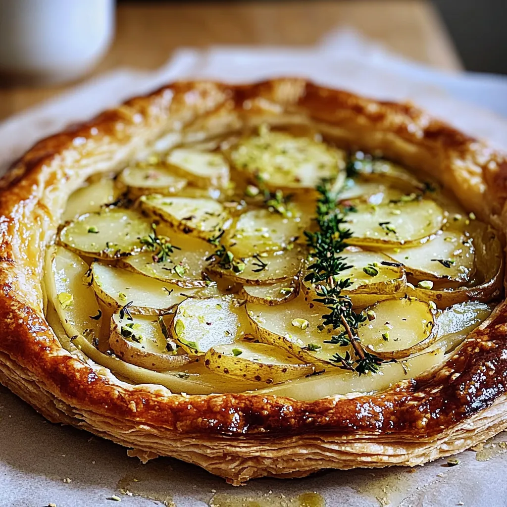 Savor a buttery galette filled with leek and potato, topped with a crunchy pistachio crust. Perfect for any gathering or cozy meal!