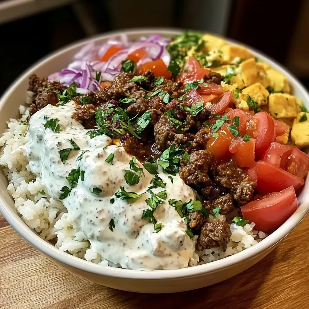 4. Assemble the Bowls: Start with a base of rice or warm pita. Top with a generous scoop of that spiced lamb goodness. Add fresh tomatoes, cucumber, red onion, olives, and feta cheese. Feel free to layer it up!