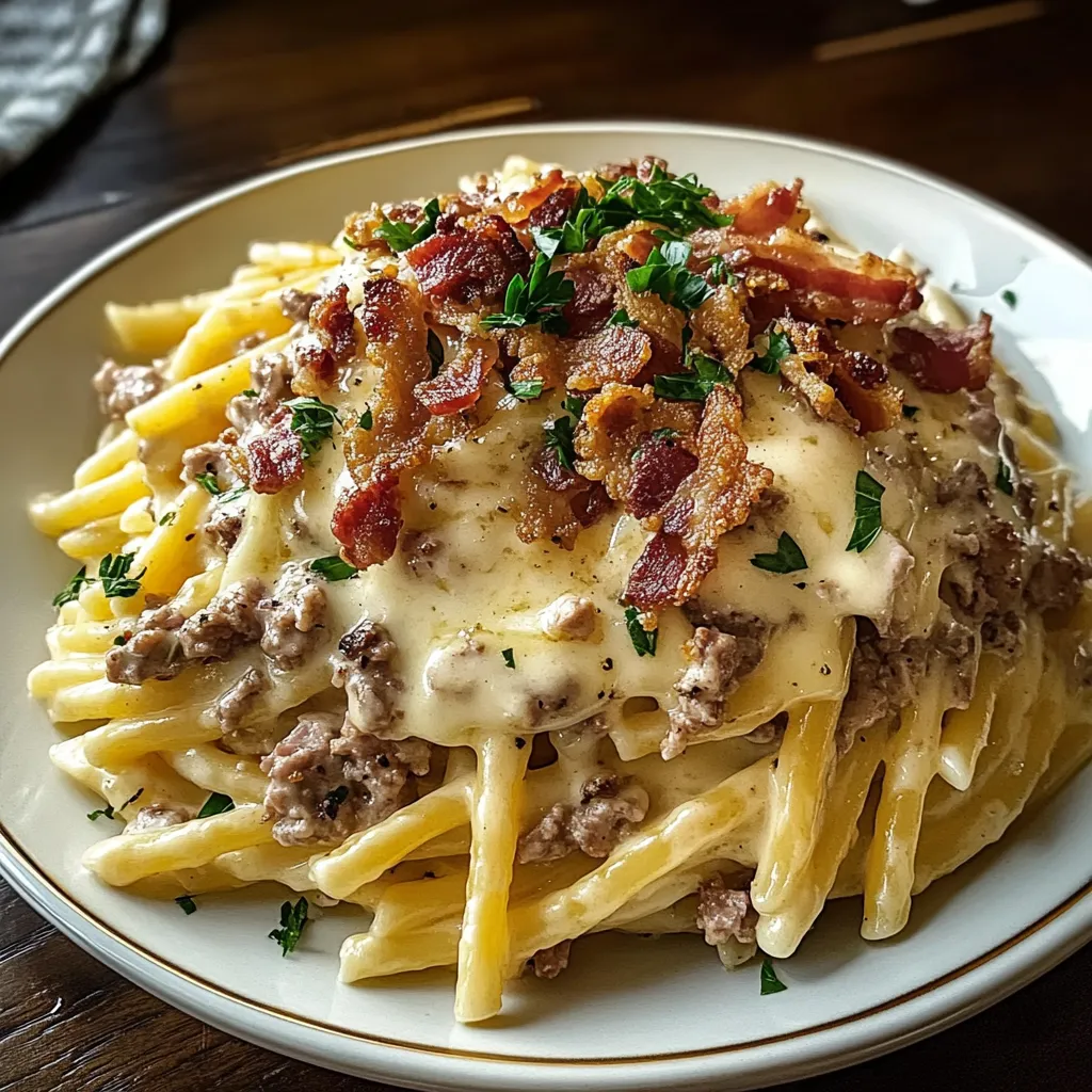 Indulge in creamy alfredo pasta with loaded bacon and cheeseburger flavors Perfect for a hearty meal this dish will satisfy every craving