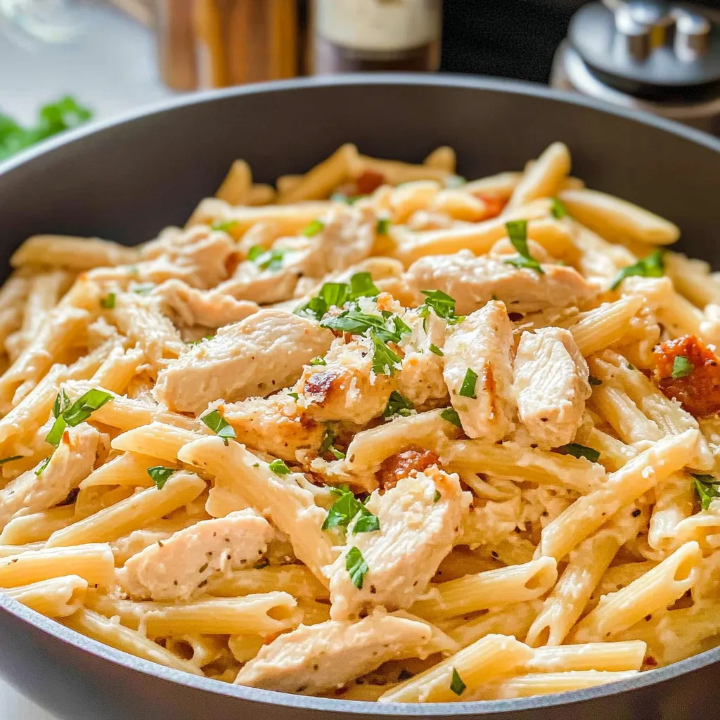 A creamy pasta infused with tender chicken, sun-dried tomatoes, and fresh herbs that’s sure to become a favorite in your home.