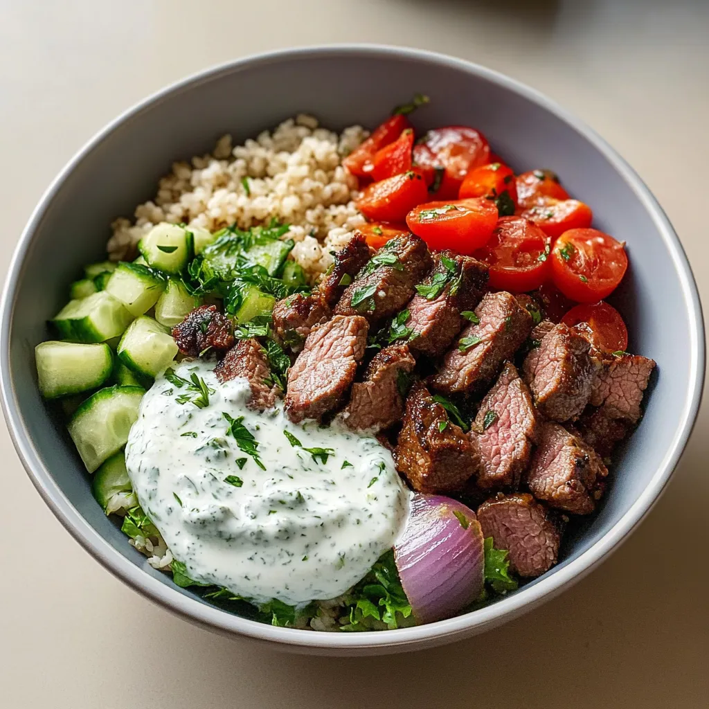 A fresh and hearty Mediterranean beef bowl topped with herbed yogurt sauce, featuring tender spiced beef, fresh veggies, and a creamy sauce, perfect for any meal.