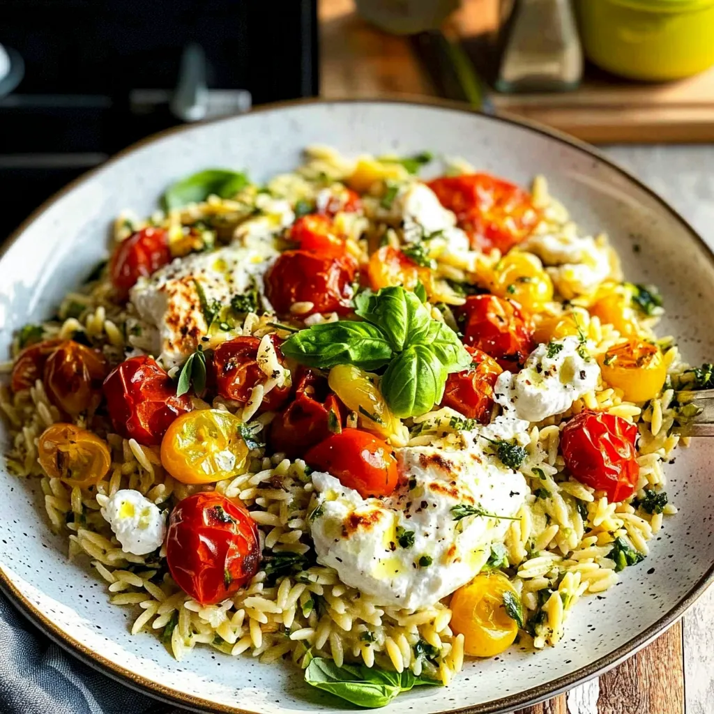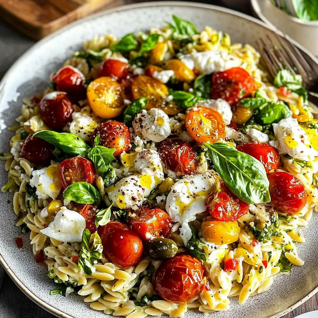 Savor a vibrant orzo salad featuring roasted tomato vinaigrette and creamy burrata. A perfect dish for fresh flavors and delightful textures!