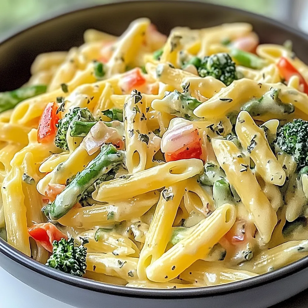 Savor the taste of Pasta Primavera with creamy herb sauce A fresh Italian dish perfect for any meal Easy to make delicious to enjoy 153 chars