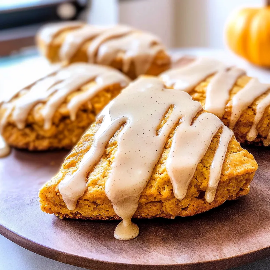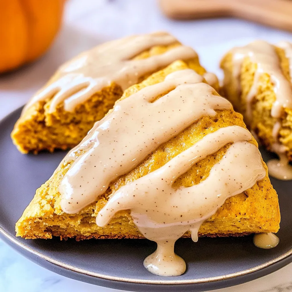 Delight in pumpkin scones topped with a sweet maple cinnamon glaze Perfect for cozy mornings these treats are sure to impress