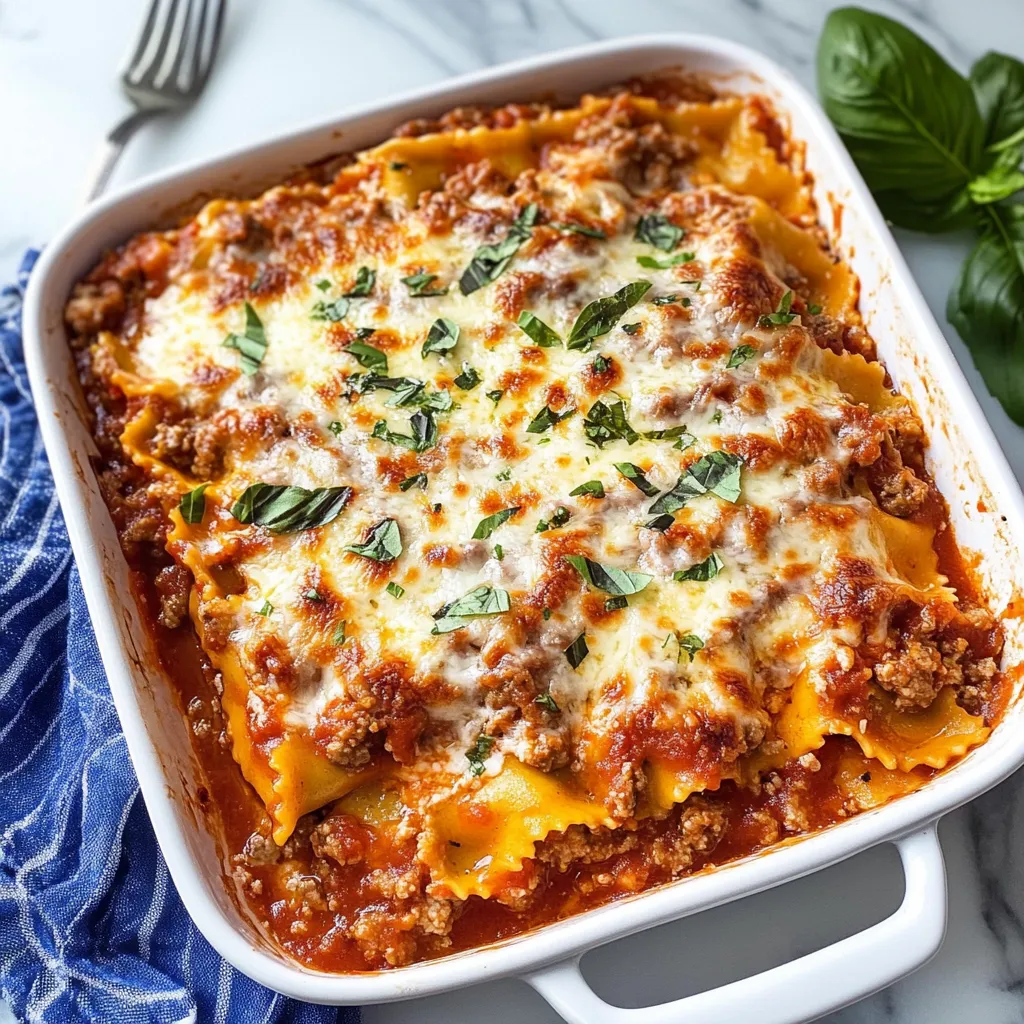 A cozy and comforting dish that combines ravioli and lasagna, perfect for busy weeknight dinners or cozy weekend meals.