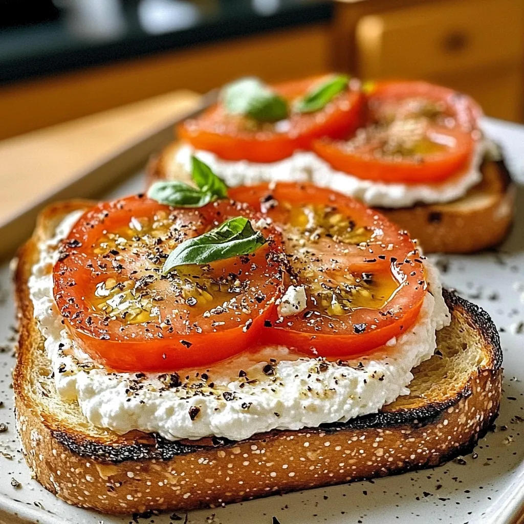 A delightful toast combining creamy ricotta and fresh tomatoes on crispy sourdough, perfect for breakfast or dinner.