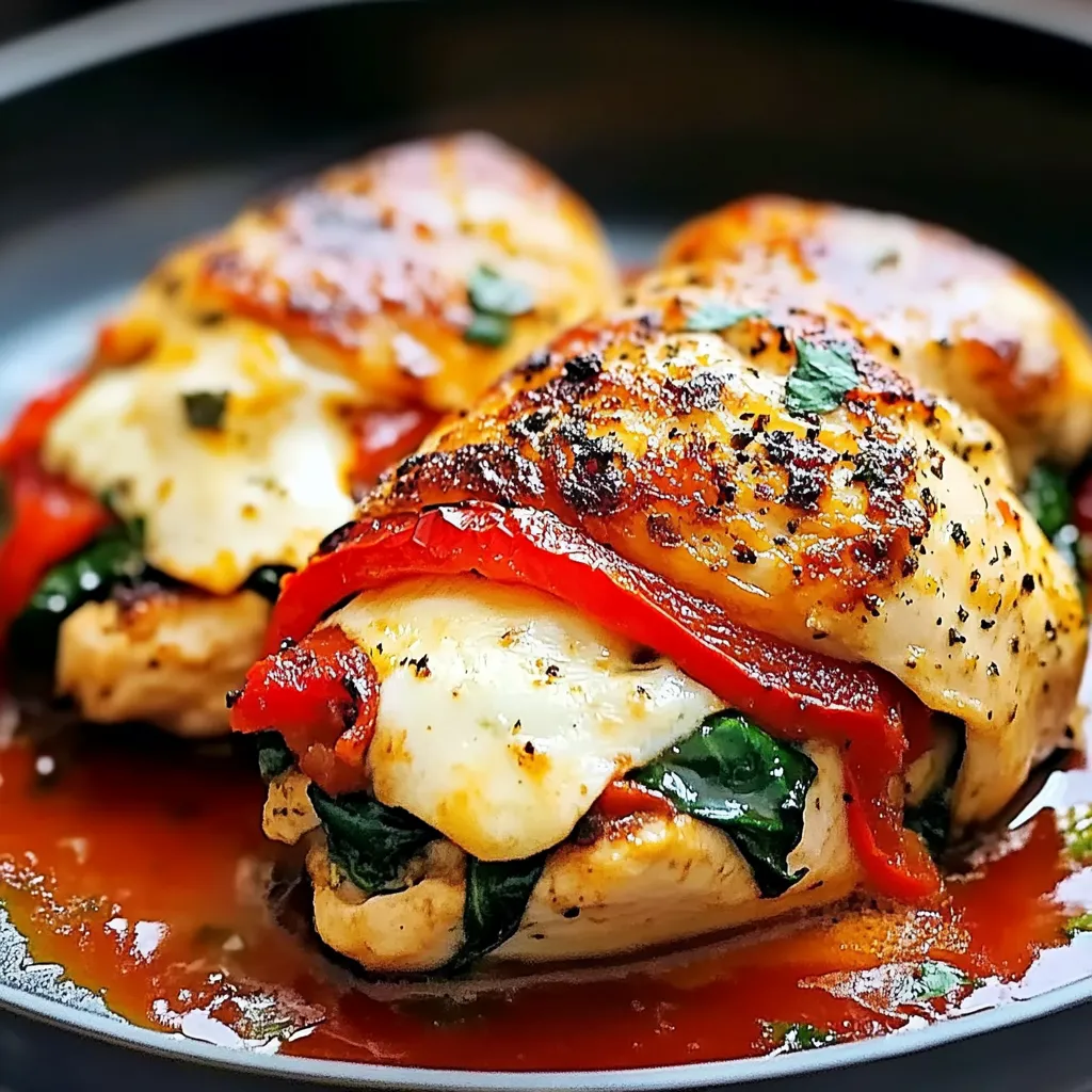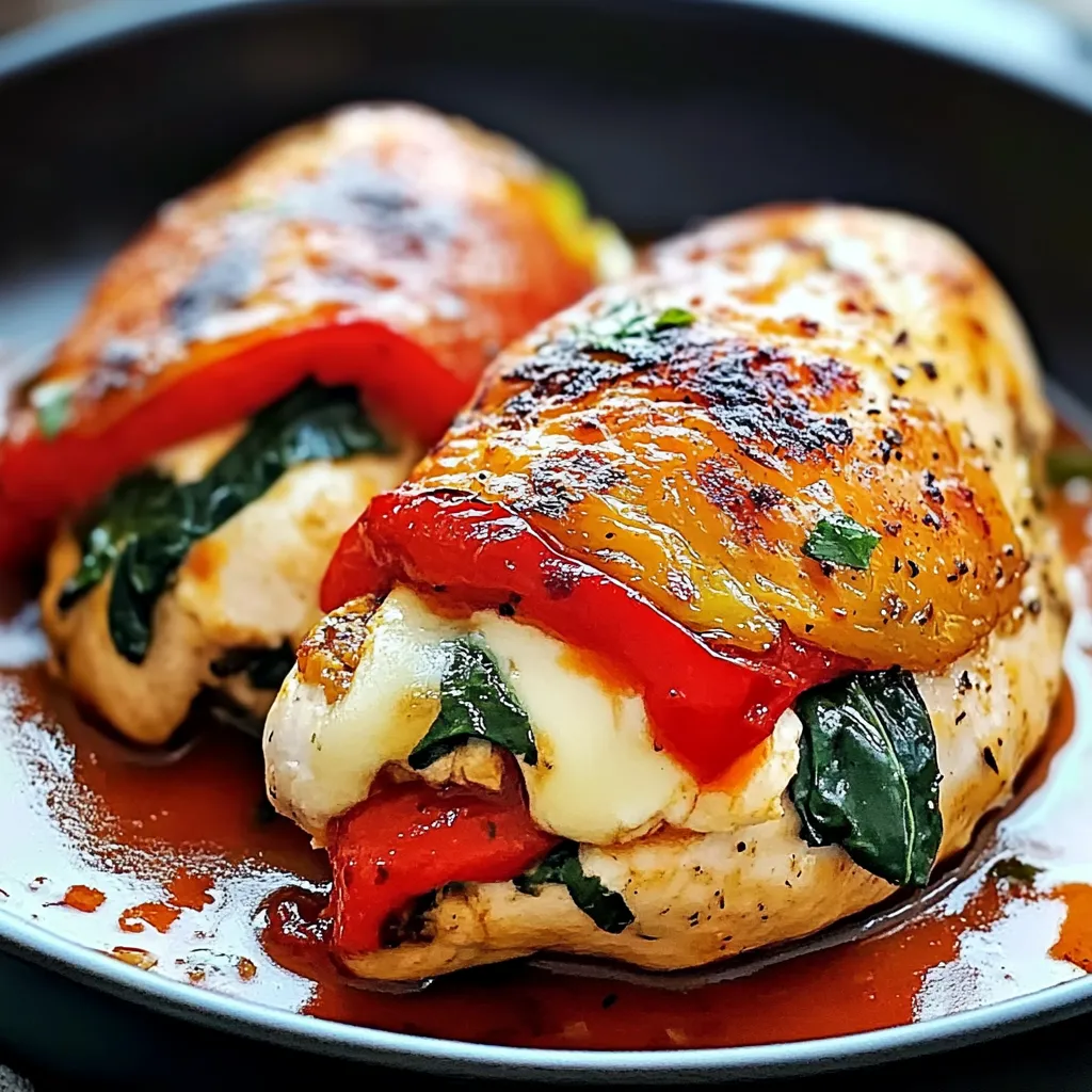 A comforting and delicious stuffed chicken dish featuring roasted red peppers, spinach, and mozzarella cheese.