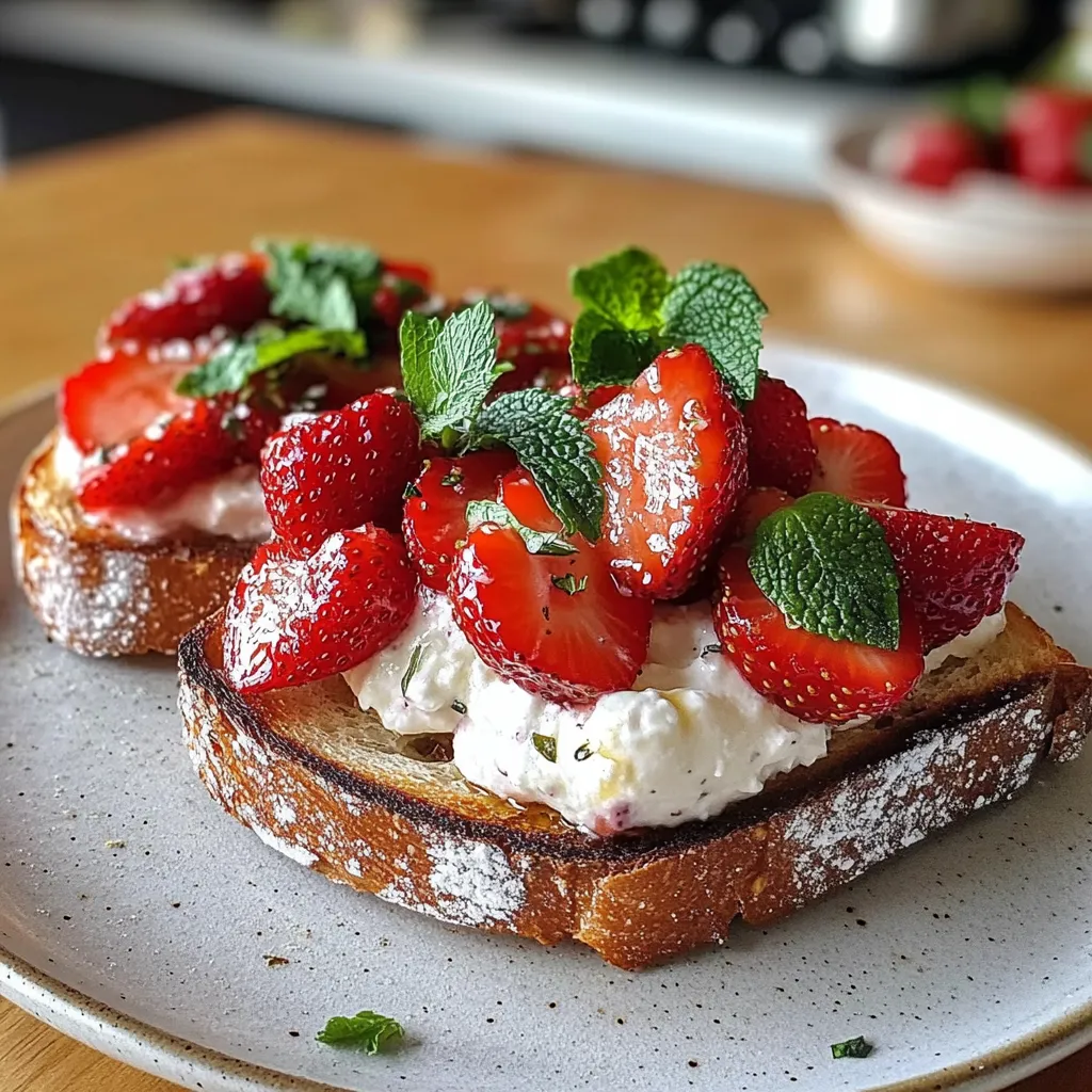 Savor toasted bread topped with roasted strawberry and whipped ricotta—an easy, flavorful treat perfect for breakfast or a fancy brunch.