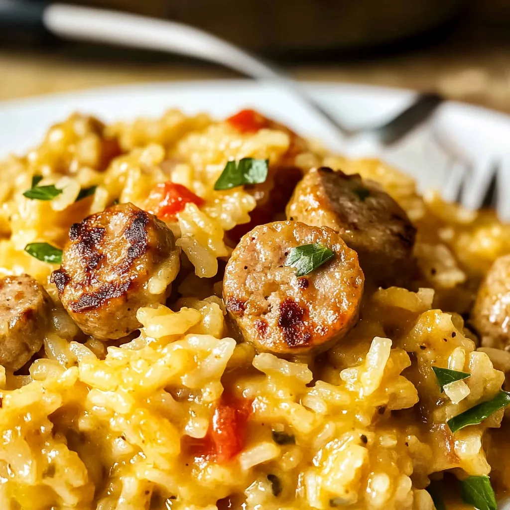 A hearty and comforting one-pot meal featuring sausage, rice, and colorful vegetables, perfect for weeknight dinners.