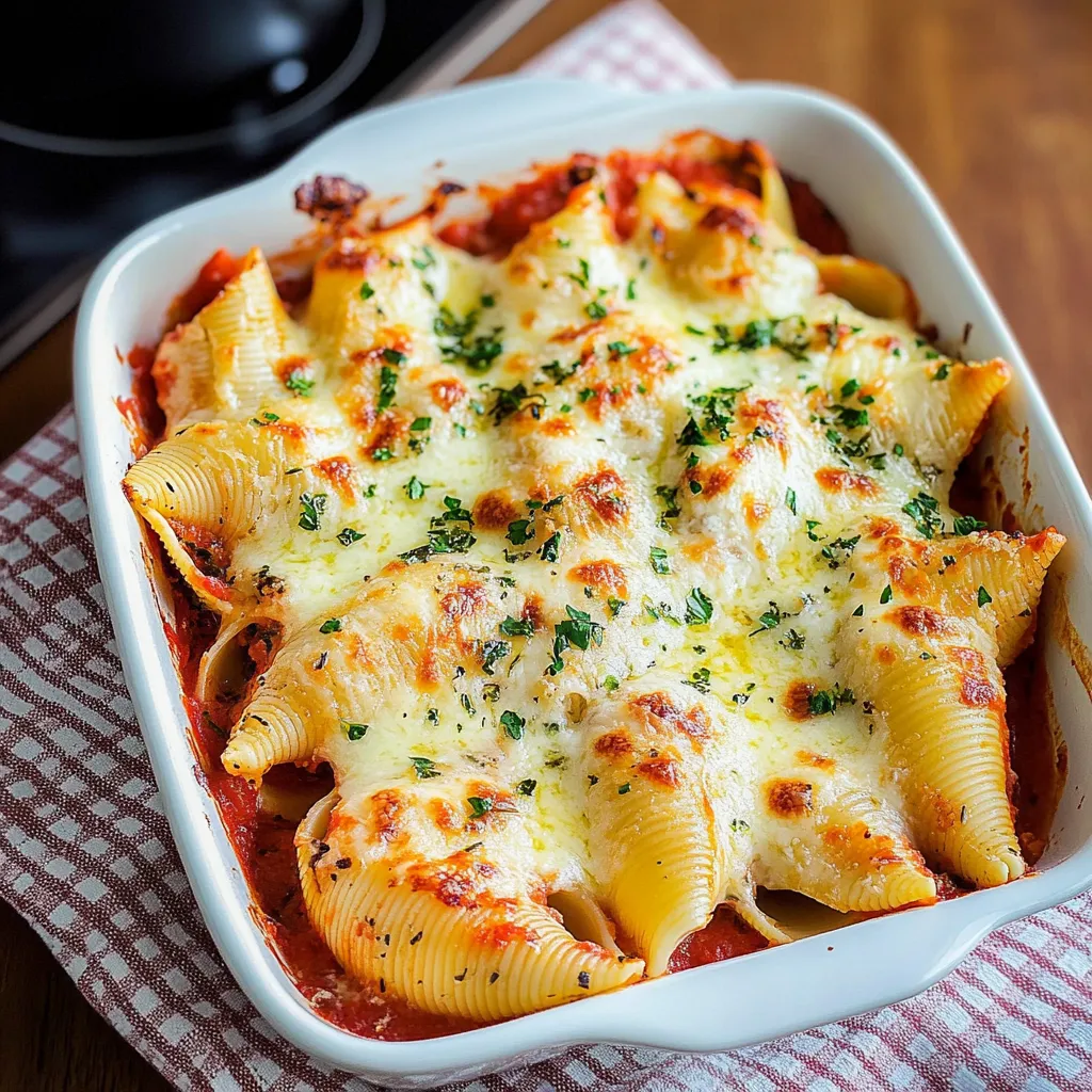 A delicious recipe for stuffed shells filled with a creamy cheese mixture, topped with marinara sauce and baked to perfection.