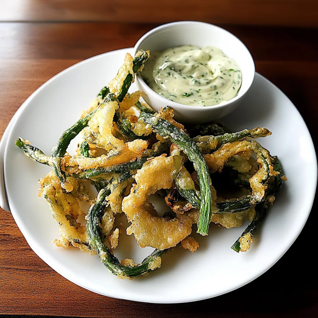 Crispy tempura garlic scapes paired with zesty aioli, perfect for a flavorful snack or appetizer. Try this unique dish today! (154 chars)
