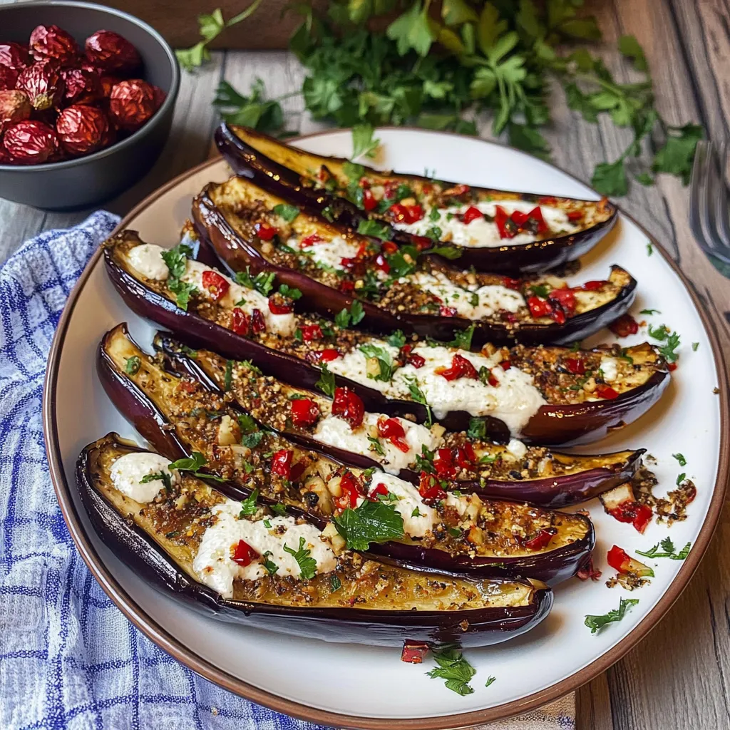 - Prepare the eggplants: Slice them in half lengthwise. Score the flesh in a diamond pattern to allow the flavors to seep in. Drizzle with olive oil and sprinkle with salt. Place them cut side down on a baking sheet lined with parchment paper.
