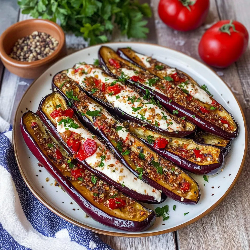 - Fill the eggplants: Spoon the veggie mix back into the roasted eggplant halves, packing them generously.
