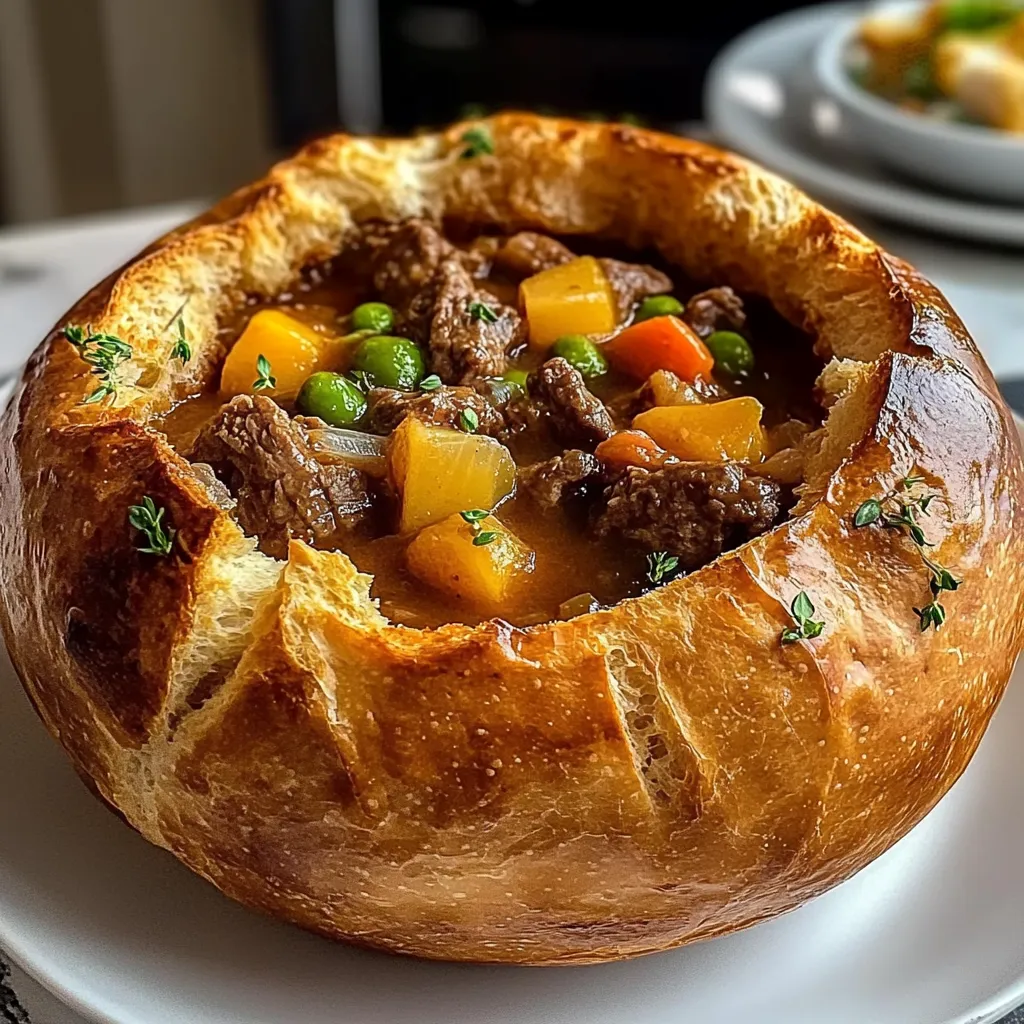 A heartwarming recipe for Traditional Beef Stew served in a crusty bread bowl. This cozy dish is perfect for chilly nights and uses simple ingredients for an interactive meal experience.