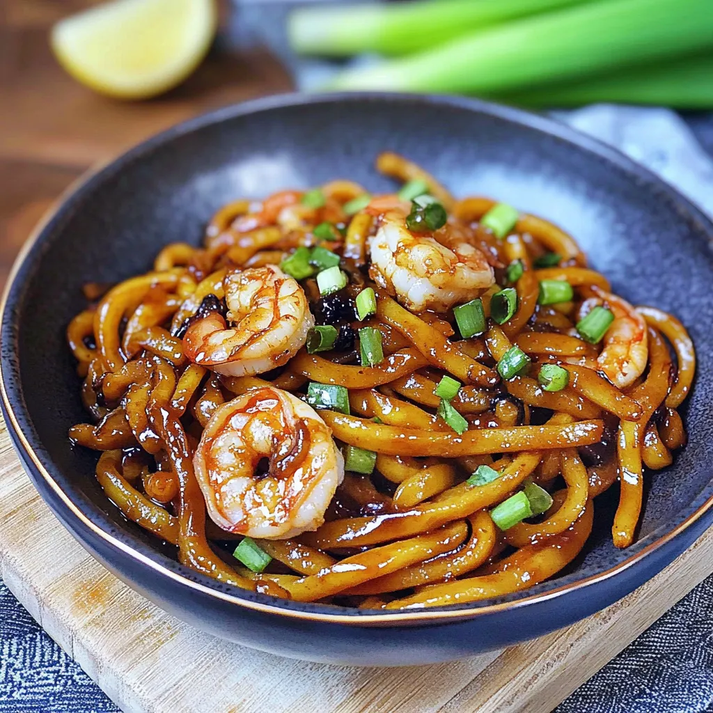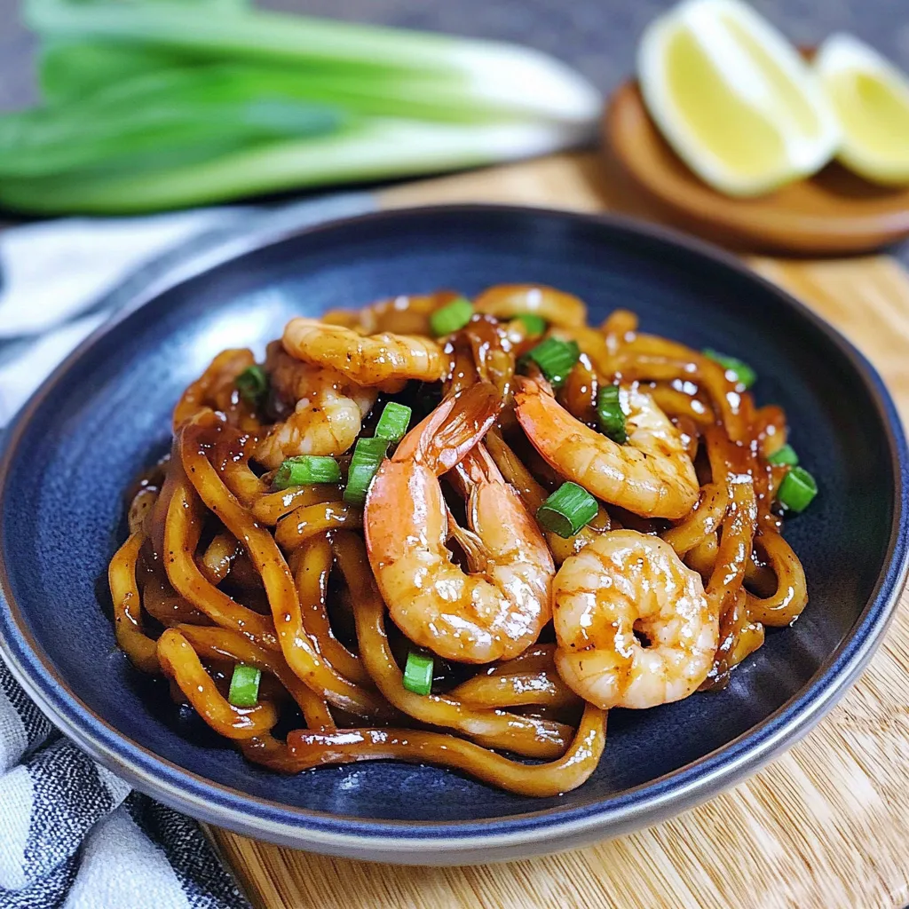 A comforting and quick recipe for Yaki Udon with Shrimp, featuring chewy udon noodles stir-fried with shrimp, colorful vegetables, and a savory sauce, ready in under 30 minutes.